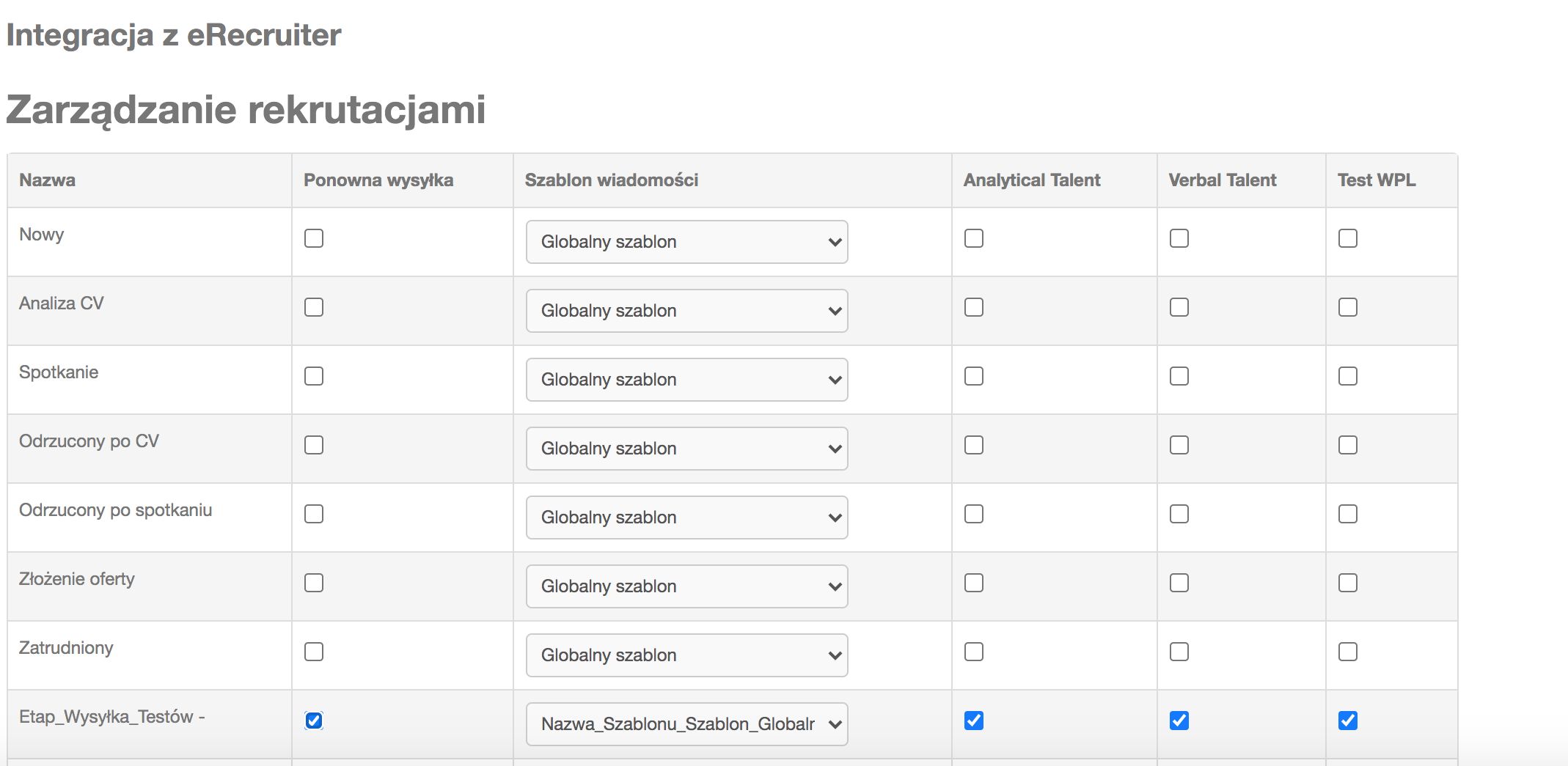 2. W tym celu możemy zmienić kandydatowi etap rekrutacji na inny, niż miał dotychczas, który także jest powiązany z wysyłką testów. Możemy również przypisać w systemie Talent Bridge do etapu rekrutacyjnego funkcjonalność „ponowna wysyłka”. Wówczas przy zmianie etapu u kandydata w systemie eRecruiter, który jest oznaczony jako „ponowna wysyłka”, zostaną wysłane wszystkie testy, które mają status „test przerwano” albo „nie rozwiązano”. W celu przypisania do etapu rekrutacyjnego opcji „ponowna wysyłka” należy zalogować się na konto Talent Bridge i przejść do zakładki „Ustawienia / integracje” (https://panel.talentbridge.pl/settings/data/integration.html). W kolejnym kroku klikamy przycisk „Etapy rekrutacji” i klikamy checkbox w kolumnie o nazwie „Ponowna wysyłka” w wierszu z odpowiednią nazwą rekrutacji.
